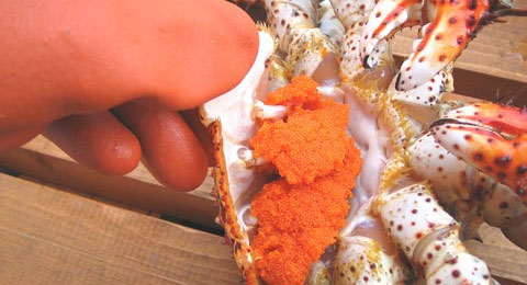 右上写真の内側にあるオレンジ色は花咲がにの卵です。もちろん、ボイル後お召し上がりいただけます。
